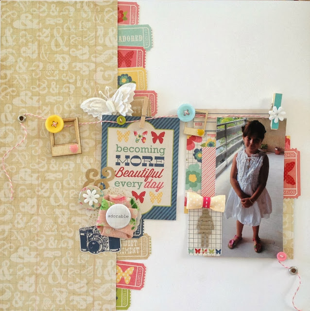 Εγώ χρησιμοποίησα 2 brads για να στερεώσω το κορδονάκι μου στη σύνθεση που έκανα, χρησιμοποιώντας μια αγαπημένη φωτογραφία της κόρης μου, όταν ήταν 5 χρονών!Αφού "έστησα" τη σελίδα μου, έφτιαξα ένα φιογκάκι με τα ασορτι χρώματα της σύνθεσης και έφτιαξα επίσης ένα λουλουδάκι από ύφασμα, ακολουθώντας την ιδέα αυτού του blog για δημιουργικές μαμάδες και όχι μόνο....!!!