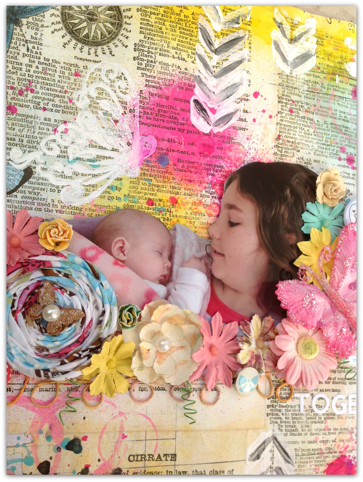 I used some paints, mists, gesso, different types of flowers and a handmade tissue flower i made by myself....